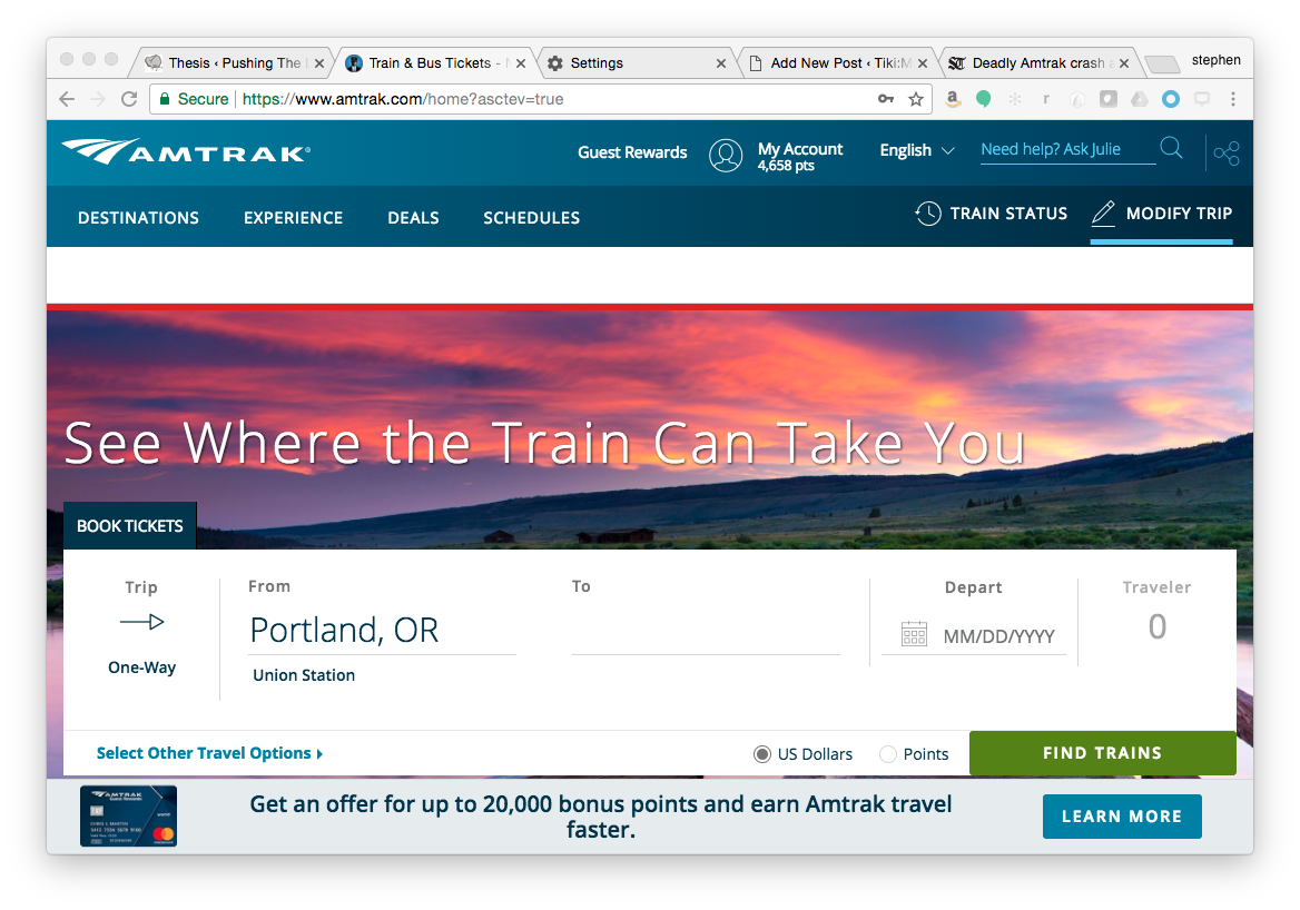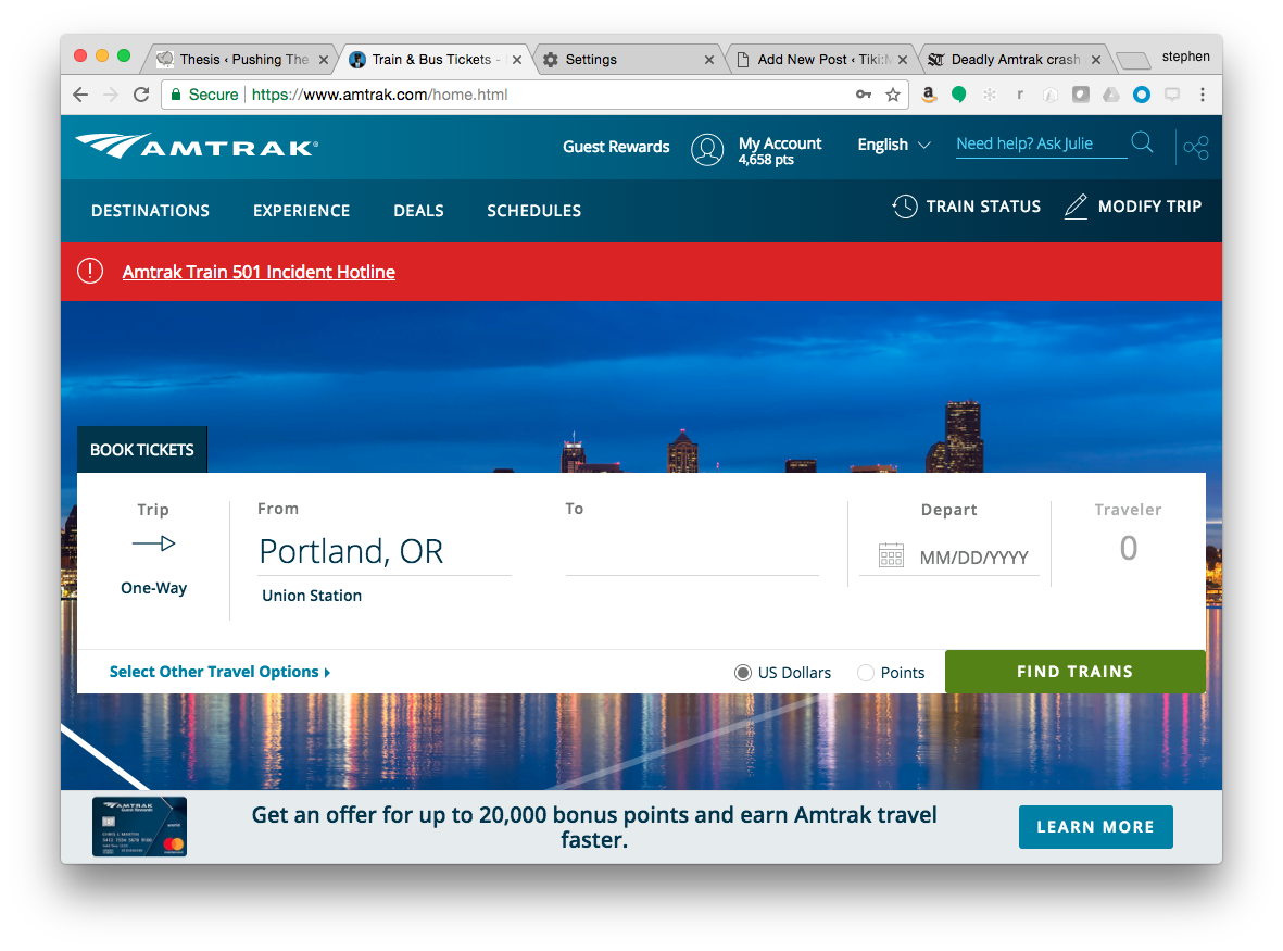 Sadly, three people died from that mistake. The blow-back seems to include a malfunctioning web site. In a few days I am taking Amtrak from Portland to Tacoma (on the proven track with the old train). But I need to change the day I leave. Pity the web site won’t let me do it: