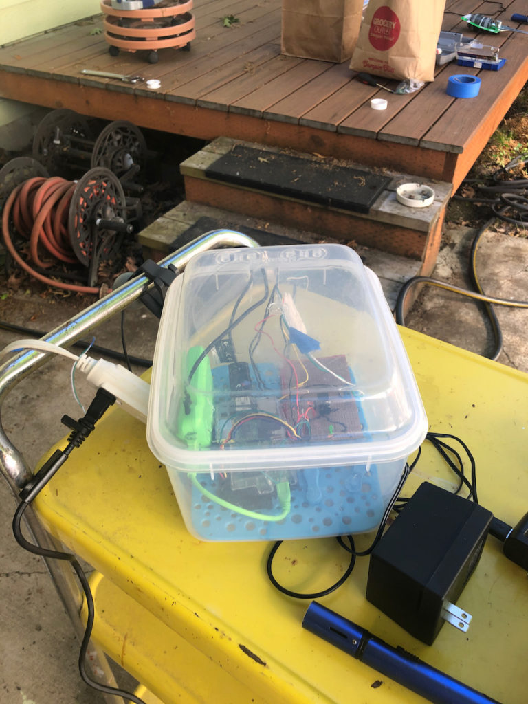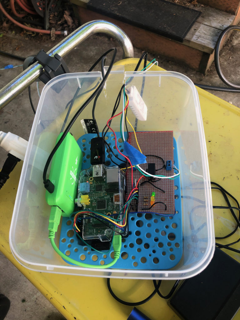 In my case, this all has to live outside. It’s not going to be in direct weather, but it needs to stay dry. Simple solution: local thrift store, Tupperware style container. In there you’ll see my rPi, the controller circuit and a USB battery that will keep the rPi up and going even if there’s a power failure. You can see the temp / humidity sensor hanging outside the box.