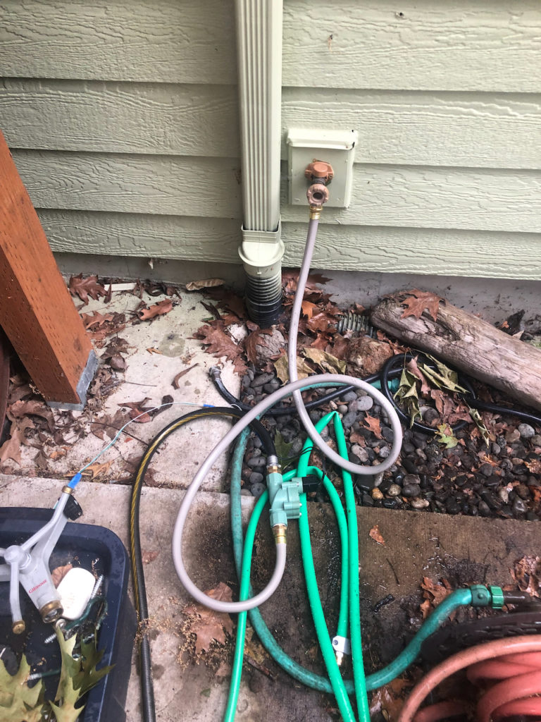 Here you can see the valve in-line with the hose. When you set this up, keep in mind that the valve connections are not the same size as regular garden hoses. So, check Ben’s instructions on that. Also keep in mind that you need the house–to–valve connection to not leak even a drop because it will be turned on 24×7.